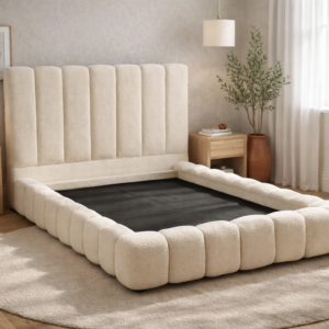 The Arlo Bouclé Bed Frame is designed to bring softness and structure together in a modern bedroom setting. Upholstered بالكامل in textured cream bouclé fabric, it features a tall, vertically channeled headboard that adds subtle depth and a refined look.